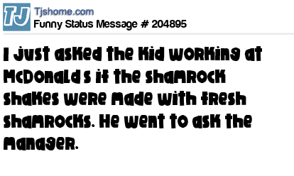 X says I just asked the kid working at McDonald’s if the shamrock shakes were made with fresh shamrocks. He went to ask the manager.
