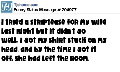 - # 205387 tried a striptease for my wife last night but it didn’t go well. I got my shirt stuck on my head, and by the time I got it off, she had left the room.