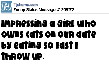 X says Impressing a girl who owns cats on our date by eating so fast I throw up.