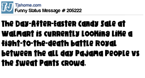X says The Day-After-Easter Candy Sale at Walmart is currently looking like a fight-to-the-death battle Royal between the all day Pajama People vs the Sweat Pants crowd.