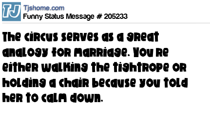 X says The circus serves as a great analogy for marriage. You’re either walking the tightrope or holding a chair because you told her to calm down.