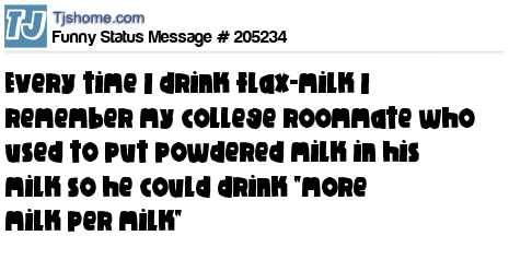 X says Every time I drink flax-milk I remember my college roommate who used to put powdered milk in his milk so he could drink "more milk per milk"