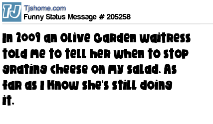 - # 194209 In 2003 an Olive Garden waitress told me to tell her when to stop grating cheese on my salad. As far as I know she's still doing it.