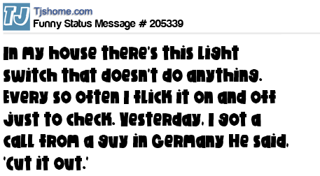 X says In my house there's this light switch that doesn't do anything. Every so often I flick it on and off just to check. Yesterday, I got a call from a guy in Germany He said, 'Cut it out.'