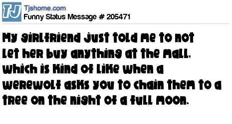 X says My girlfriend just told me to not let her buy anything at the mall, which is kind of like when a werewolf asks you to chain them to a tree on the night of a full moon.