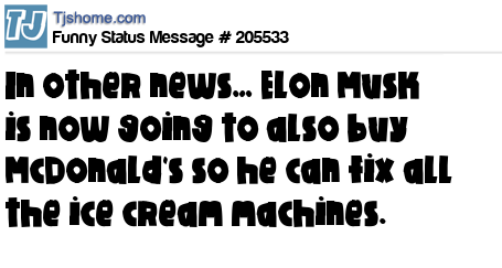 - # 205435 In other news… Elon musk is now going to also buy McDonald’s so he can fix all the ice cream machines