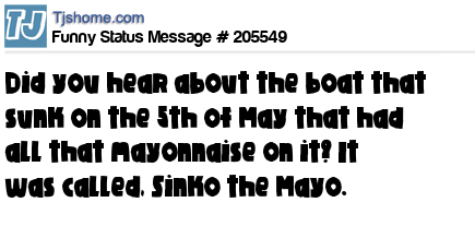 X says Did you hear about the boat that sunk on the 5th of May that had all that mayonnaise on it? It was called, Sinko the Mayo.