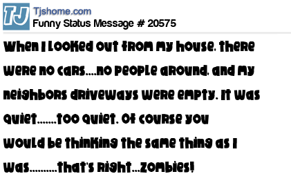 X says When I looked out from my house, there were no cars....no people around, and my neighbors driveways were empty. It was quiet.......too quiet. Of course you would be thinking the same thing as I was..........that's right...Zombies!