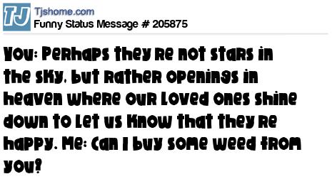 X says You: Perhaps they’re not stars in the sky, but rather openings in heaven where our loved ones shine down to let us know that they’re happy. Me: Can I buy some weed from you?