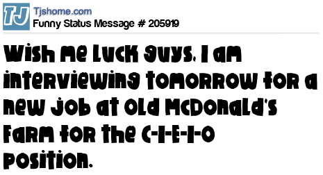 X says Wish me luck guys, I am interviewing tomorrow for a new job at Old McDonald's Farm for the C-I-E-I-O position.