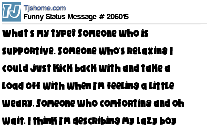 - # 164871 What's my type? Someone who's supportive. Someone who comforts me when I need them. Someone I can curl up and relax with. Oh great, I'm describing my bed again.