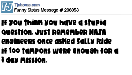 X says If you think you have a stupid question, just remember NASA engineers once asked Sally Ride if 100 tampons were enough for a 7 day mission.