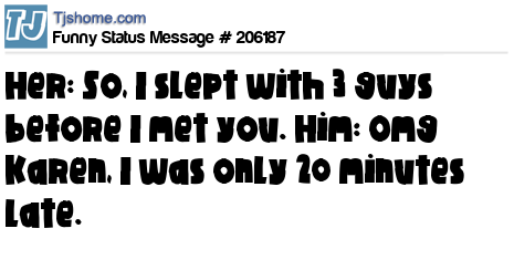 X says Her: So, I slept with 3 guys before I met you. Him: Omg Karen, I was only 20 minutes late.