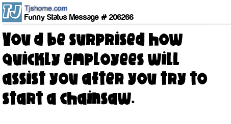 - # 204323 You'd be surprised at how quick Home depot employees help you after ignoring you for 20 minutes when you try to start a chainsaw...