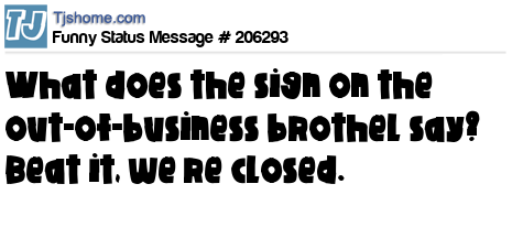 X says What does the sign on the out-of-business brothel say? Beat it, we’re closed.