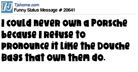 X is I could never own a Porsche because I refuse to pronounce it like the Douche Bags that own them do.