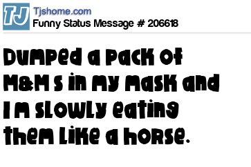 - # 199899 I just dumped a pack of M&M’s into my mask and am slowly eating them like a horse