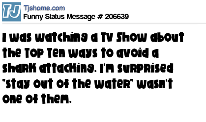 - # 208724 I was watching a TV show on the top ten ways to avoid a shark attack. I was shocked to hear that "stay out of the water" wasn't number one.