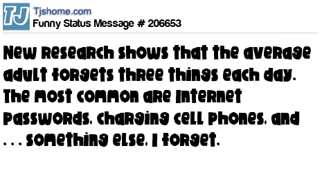 X says New research shows that the average adult forgets three things each day. The most common are Internet passwords, charging cell phones, and . . . something else, I forget.