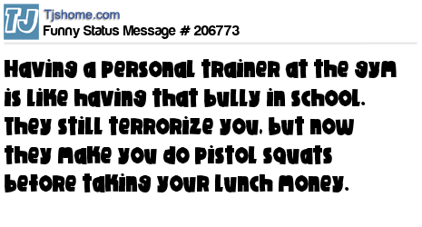 X says Having a personal trainer at the gym is like having that bully in school. They still terrorize you, but now they make you do pistol squats before taking your lunch money.