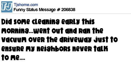 X says Did some cleaning early this morning...went out and ran the vacuum over the driveway just to ensure my neighbors never talk to me....