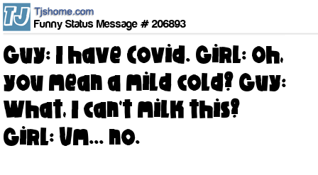 X says Guy: I have Covid. Girl: Oh, you mean a mild cold? Guy: What, I can't milk this? Girl: Um... no.