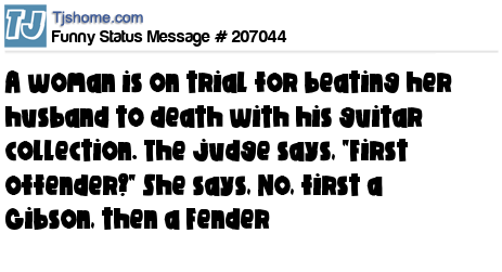 - # 179793 A woman is on trial for beating her husband to death with his guitar collection. The judge says, "First offender?" She says, "No, first a Gibson, then a Fender!"