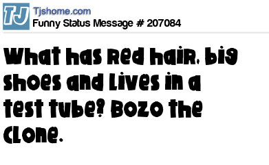 - # 178581 What has red hair, big feet, and lives in a test tube? Bozo the Clone.
