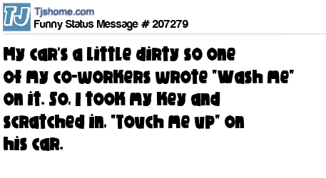 X is My car's a little dirty so one of my co-workers wrote "Wash me" on it. So, I took my key and scratched in, "Touch me up" on his car.