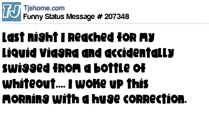 X says Last night I reached for my liquid Viagra and accidentally swigged from a bottle of whiteout.... I woke up this morning with a huge correction.