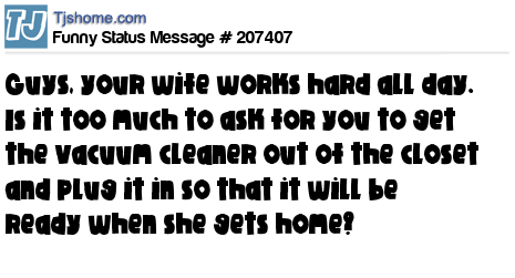 - # 202848 Guys, your wife works hard. Would it be too much trouble to get out the vacuum cleaner and plug it in so it will be ready for her when she gets home from work?