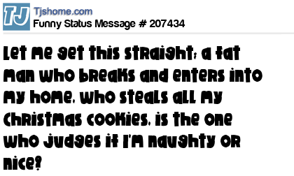 X is Let me get this straight; a fat man who breaks and enters into my home, who steals all my Christmas cookies, is the one who judges if I'm naughty or nice?