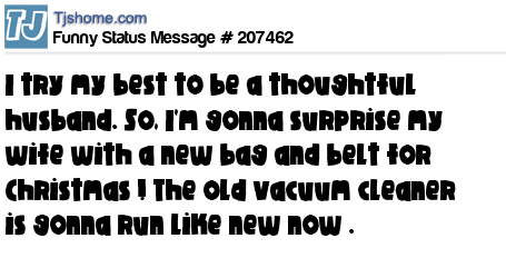 - # 208637 I try my best to be a thoughtful husband. So, I surprised my wife with a new bag and belt for Christmas ! The old vacuum cleaner is gonna run like new now .