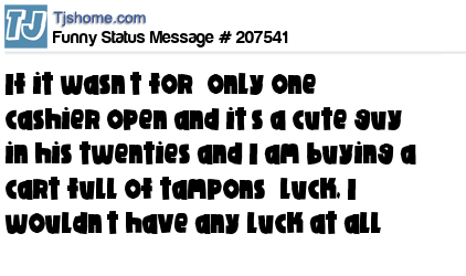 X says If it wasn’t for “only one cashier open and it’s a cute guy in his twenties and I am buying a cart full of tampons” luck, I wouldn’t have any luck at all