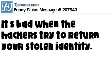 - # 85429 I had my identity stolen the day after Christmas. It was reurned in yesterday's mail with $20 and a note that read, "Damn dude, no one owants to be you!"
