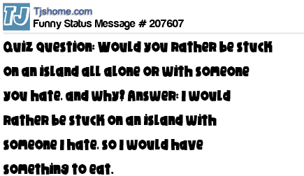 X says Quiz question: Would you rather be stuck on an island all alone or with someone you hate, and why? Answer: I would rather be stuck on an island with someone I hate, so I would have something to eat.