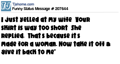 - # 196261 I yelled at my wife “Your skirt is way too short” She replied, “That’s because it’s made for a woman. Now take it off & give it to me"