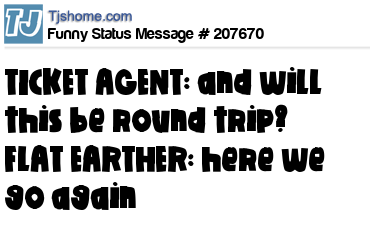 X says TICKET AGENT: and will this be round trip? FLAT EARTHER: here we go again