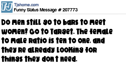 - # 178981 hy do guys go to bars to meet women? Go to Target. There's like 10 women to each man and they're already there looking for things they don't need.