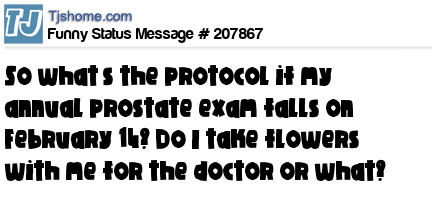 X says So what’s the protocol if my annual prostate exam falls on February 14? Do I take flowers with me for the doctor or what?