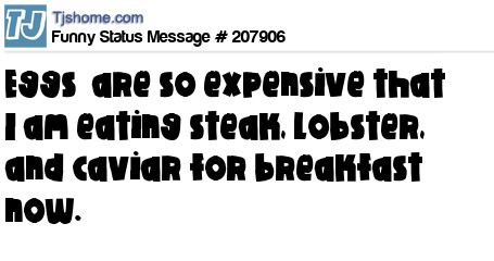 X Eggs are so expensive that I am eating steak, lobster, and caviar for breakfast now.