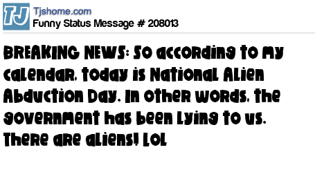 X is BREAKING NEWS: So according to my calendar, today is National Alien Abduction Day. In other words, the government has been lying to us. There are aliens! Lol