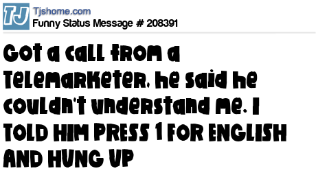 X says Got a call from a Telemarketer, he said he couldn't understand me. I TOLD HIM PRESS 1 FOR ENGLISH AND HUNG UP