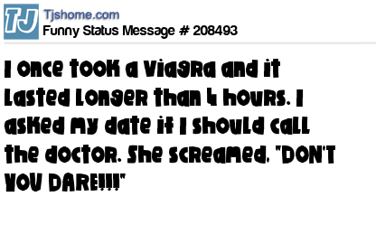 X says I once took a Viagra and it lasted longer than 4 hours. I asked my date if I should call the doctor. She screamed, "DON'T YOU DARE!!!"