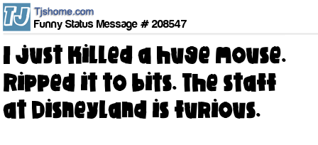 - # 209685 I just killed a huge mouse. Ripped it to bits. The staff at Disneyland are furious.