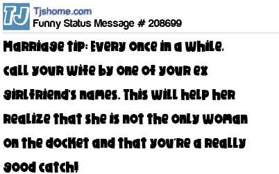 - # 209513 Marriage tip: Every once in a while, call your wife by one of your ex-girlfriend's names. This will help her realize that she is not the only woman on the docket, and that you're a really good catch!