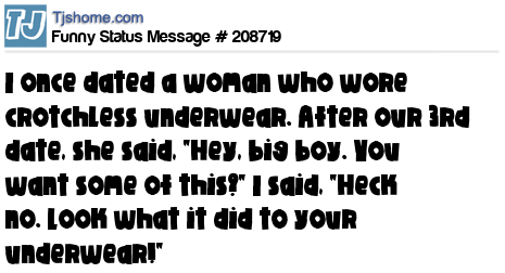 X says I once dated a woman who wore crotchless underwear. After our 3rd date, she said, "Hey, big boy. You want some of this?" I said, "Heck no. Look what it did to your underwear!"
