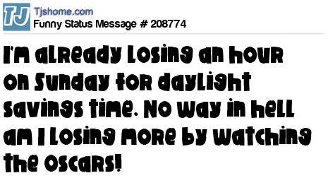 X is I'm already losing an hour on Sunday for daylight savings time. No way in hell am I losing more by watching the Oscars!