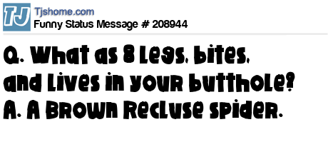 X says Q. What as 8 legs, bites, and lives in your butthole? A. A Brown Recluse spider.