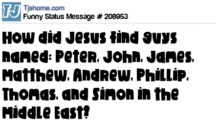 - # 128986 Who says Jesus couldn't perform miracles? He managed to find mates named Matthew, Mark, Luke and John hanging around in the Middle East.